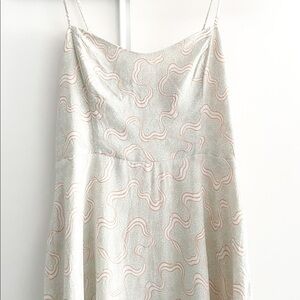 This is a dress with a fitted bodice and sweetheart neckline. It's made from a flowy crepe-like fabric that drapes nicely.