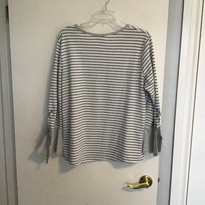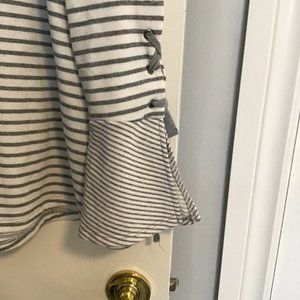 Gray and white striped sweatshirt. Bell sleeves with ties. 80% Polyester, 20% Cotton.