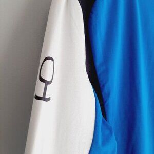 • Long sleeve mock neck 1/2 zip top with in blue, white and grey. One front chest zipper closure pocket.