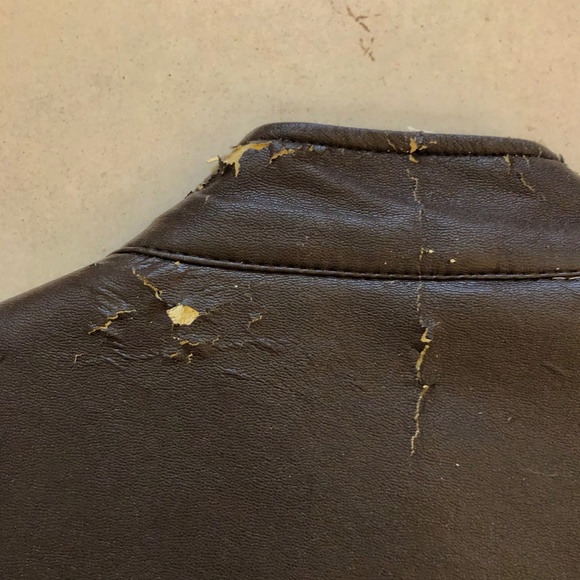 The COOLEST vintage embossed nascar racer vibes jacket! Brown with white stripes, super cute. NOTE: THE CONDITION IS NOT GREAT, THERE IS SIGNIFICANT PEELING, HENCE LOW PRICE