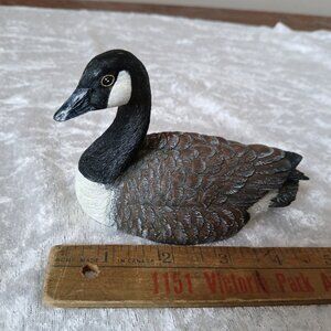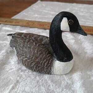 This is a vintage (circa 2000) small resin decoy sculpture of a Canadian Goose. Made by Marshland Collectibles (a registered trademark of Avon).