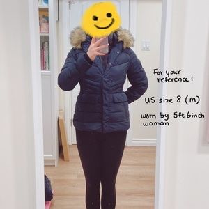 Like new, lightly worn. Very warm jacket for -20 weather, but still keeps your curvy figure visible by the slim pinched waist style. V-shape optional buttons give the illusion of long slim neck. It has a giant hood with faux fur rim. Lightweight.