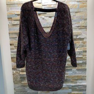 A single back panel strap adds a trendy detail to this V-neck marled knit sweater.