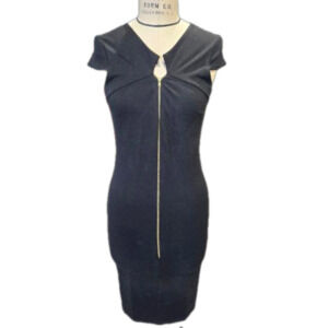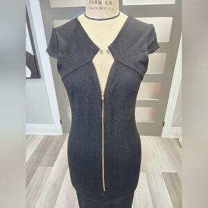Very sexy long tight dress with gold zipper. unique design around collar. medium stretch. Fits Small to Medium.