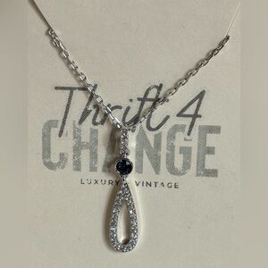 Elevate everyday looks with this refined rhodium-plated pendant. It features a feminine knot silhouette in clear crystal pave accented with a round blue crystal. Wear with a shorter or longer Swarovski pendant for this seasons multi-length layered look. The pendant measures 0.5 x 3 cm and comes on a 42 cm chain. Length: 16 1/2 inch. Pendant size: 1/4x1 1/8 inches.