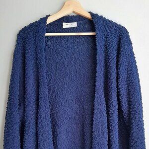 • Long sleeve open front chunky chenille knit cardi in navy blue with two open front pockets.