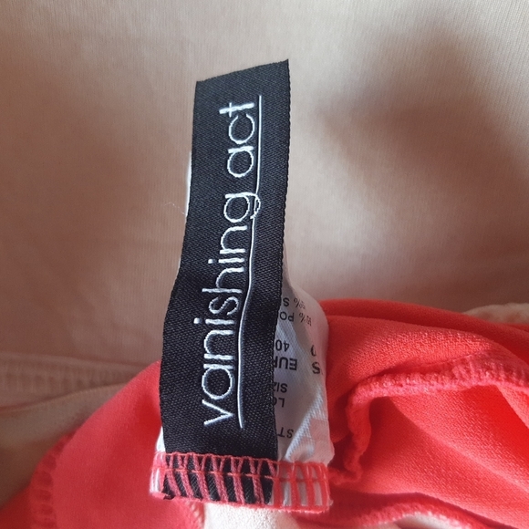 Size 10 Vanishing Act swim.top is polyester/spandex. Fully lined across chest, slight padding, adjustable straps. Nice ruffled front. 18" middle to hem, 16" armpit to armpit approximately. Vibrant pink.