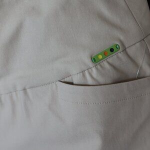 These are 3/4 length pant made from 74% Rayon, 23% Nylon and 3% Spandex and therefore wildly comfortable. They are a size 8 and never been worn. These are a very flattering design you can dress up or down. Washing instructions are to hand wash and hang dry.