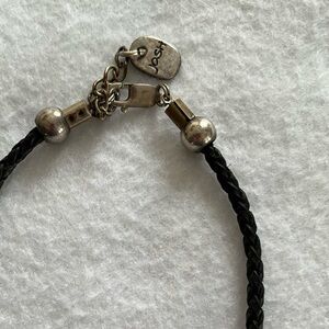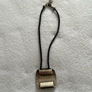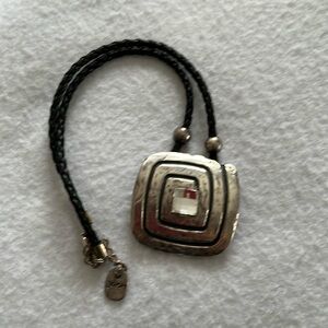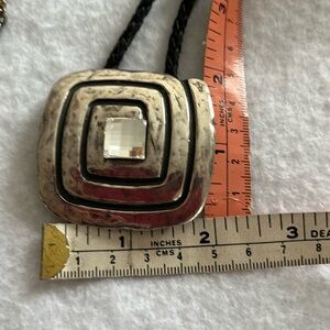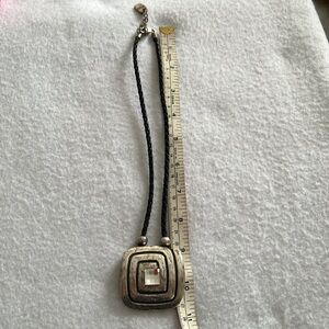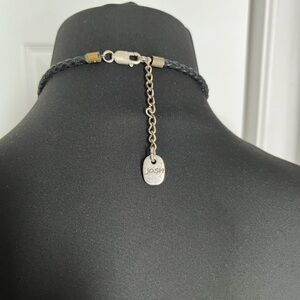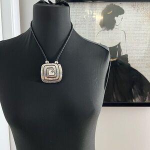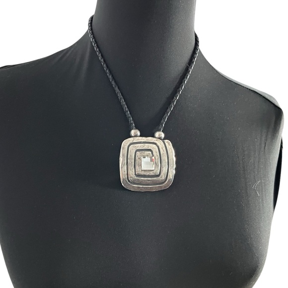 A statement piece necklace in a swirl design with a rhinestone prism gem embedded at the center on a braided cord