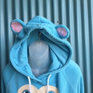 Adorable blue hoodie with a playful cartoon design. Features a cute character holding a banana.