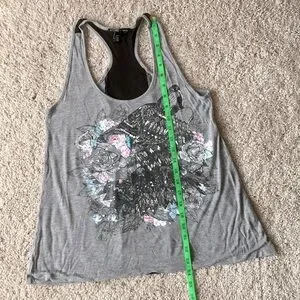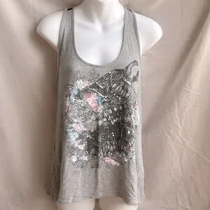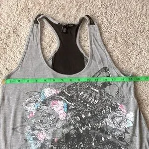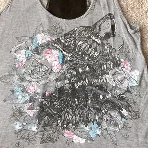 Breezy summer racer back tank top with low scoop neck. Features a tribal style design howling wolf image and a black mesh strip down the back to keep you cool on those muggy days. Pair with spandex shorts for workouts or jean shorts for summer day adventures.