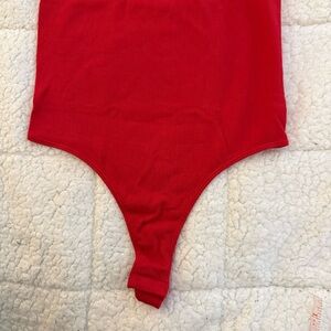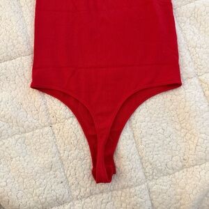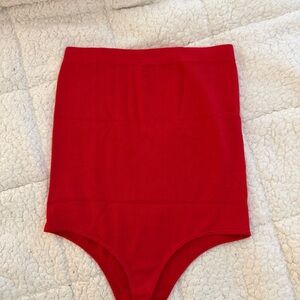 Soft ribbed bodysuit in a vibrant red. High-waist silhouette offers smooth, sleek lines. Stretch fabric for a comfortable, flattering fit. Versatile piece perfect for layering or wearing alone.