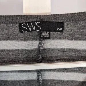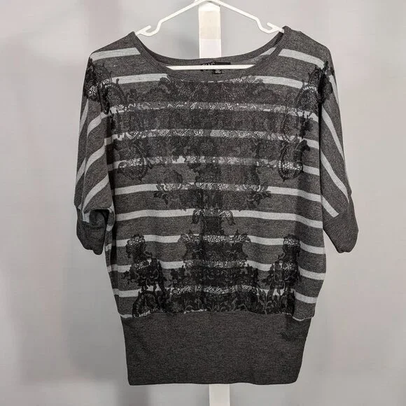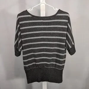 Excellent condition. Grey striped sweater top with print on front. Dolman sleeves are elbow length. Wide waistband.