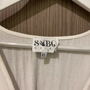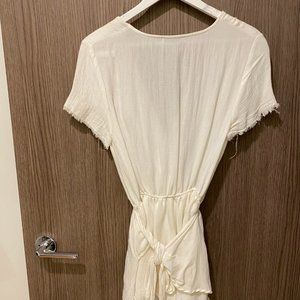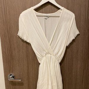 White linen fabric w/ draping tie feature + elastic waistband. Raw hem trim.