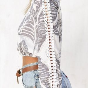 The Shady Palm Top features out exclusive greyscale print and has a V neckline with lace trim and white lace up, full length sleeves with a strip of sheer lace and elasticated waist with a bit of a crop. Pair with high waisted denim for that perfect chilled look. Exclusively designed by Sabo Skirt.