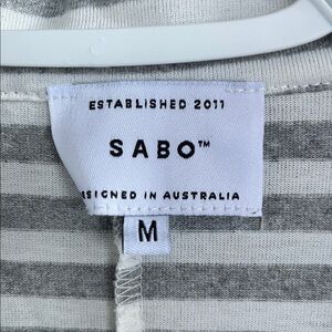 Striped romper by Sabo Skirt, designed in Australia. Features a collared neckline, button-front detail, and relaxed short sleeves. Size medium. Gently worn and in excellent condition.