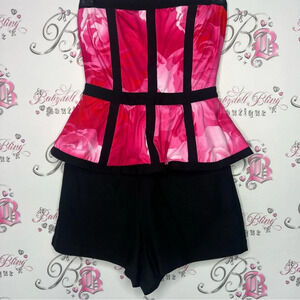 Sabo skirt romper with pink roses black shorts zipper on the back stunning stretchy material size xs! Super cute formal style romper with lovely floral rose print πβοΈ so flattering with peplum design. Can add straps if you have too. Like new condition tube top style romper strapless! πβ¨