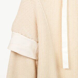 Made in Japan, this sweater from Sacai's 2016 Autumn and Winter collection is crafted in a cream wool waffle-texture knit, and features long layered sleeves with tonal paneled trim, zips on the cuffs, an asymmetrical scoop neck with an adjustable tie, a loose silhouette on the bodice, and a ribbed hem.