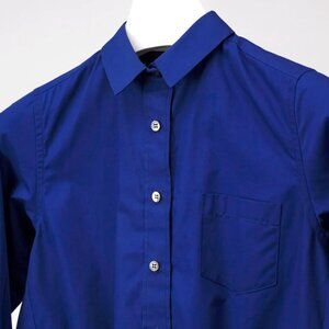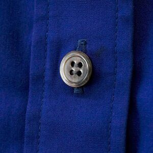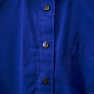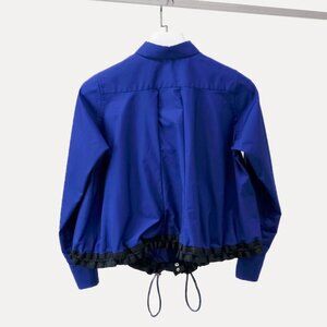 A rich blue button-up blouse from Sacai Luck with long sleeves, a left chest pocket, fitted cuffs, and an adjustable black drawstring hem.