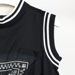 Made in Japan, this tank from Sacai's 2019 Resort collection is crafted in a black cotton jersey, and features a sleeveless design, striped ribbing on the armholes and crew neckline, a left chest patch pocket, and tonal bandana draping on the right.
