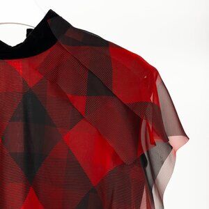 Made in Japan, this blouse from Sacai's 2022 Resort collection is crafted with a lightweight chiffon in a red and black buffalo plaid, and features flutter cap sleeves, a velvet mock neck with a back tie closure, and a back keyhole.