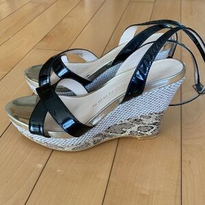 Sacha London Yvette wedge ankle criss cross strap sandal leather upper black patent leather, animal print on lower wedge