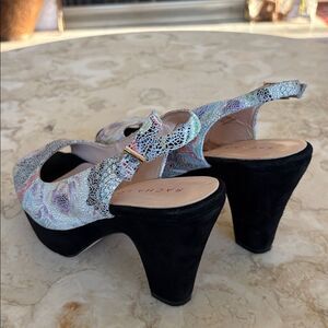 In excellent preowned condition lovely Sacha London suede leather platform heels with open toe and adjustable slingback. The upper features a stunning light floral mosaic pattern with the platform and heel in black. These shoes quality made, leather lined and super comfortable.