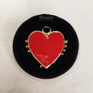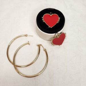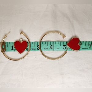 Large gold hoop pierced stud costume earrings with dangly removable red enamal hearts.