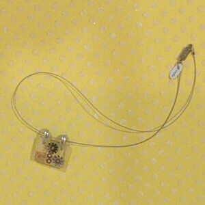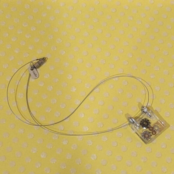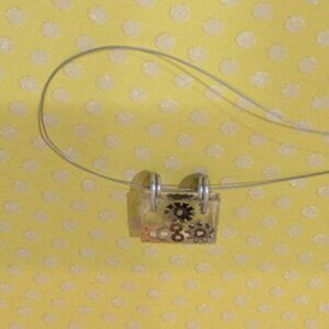 This fun steampunk style necklace is marked "Sadie" and features capacitor and wire inside a resin cube. I do not know the age, but it is pre-owned in excellent condition.