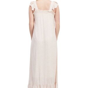 Flowy cream maxi dress with ruffle details. Perfect for any occasion.