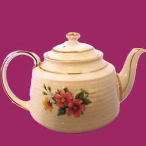 Sadler teapot is cream colored with ridges and gold accents on the edges of lid teapot, spout & handle. Sadler teapots are collectible with value depending on age, design & condition. Stamped on Bottom Sadler and England.