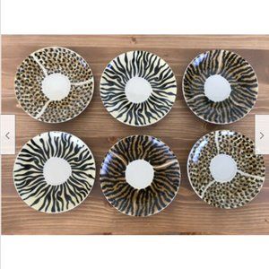 Set of 6 cups & saucers with wire carryall by L. Dake & ZN (Amsterdam). Unique safari animal designs, cups have tiger, zebra & cheetah design. Saucers include 2 each of tiger, zebra & cheetah border pattern. Cups hold approx. 4 1/2 oz. and stand approx. 2 5/8" tall. Saucers are 5 1/2" across. Very good pre-owned condition, some pieces have crazing to the glaze. Wire carryall holds all pieces neatly, carryall is 9" tall x 10" long x 7" wide including size of cups. Note that carryall is missing one of the ball "feet" from the bottom.
