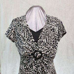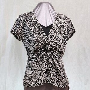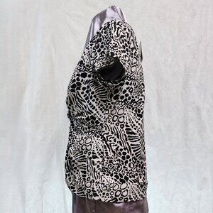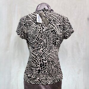 Notations Brand Y2k Blouse in new unused condition. Safari Print Black & White Blouse with Gathered Front, and inner frontal *tank*. NWT EUC. Size Large. Poly and spandex. 20 inches pit to pit aprox, and 24 inches shoulder to hem aprox without any stretch. Fabric has great stretch to it!.