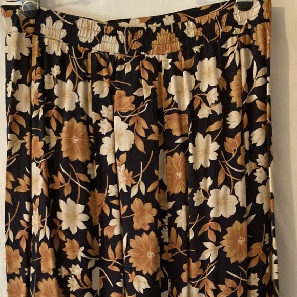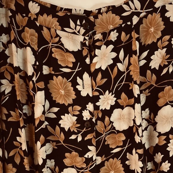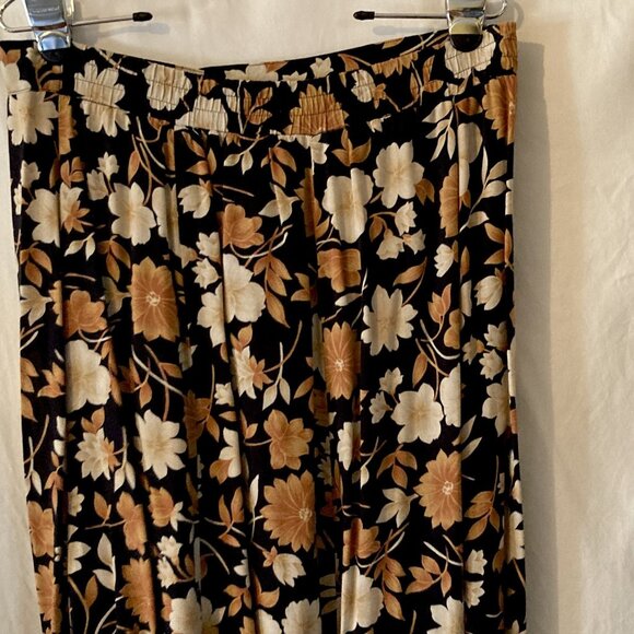 A Sag Harbor skirt front button 100% rayon, attractive drape with lots of swirl, stretchy waist, size L, fits medium to large. Muted russet, brown, cream florals on a black background. A rare find, very gently loved. VG -Excellent condition.