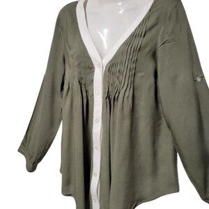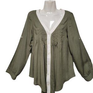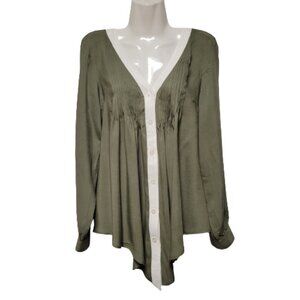 Sage Green Long Sleeve Cotton Blouse Top with White Trim Size XS S M