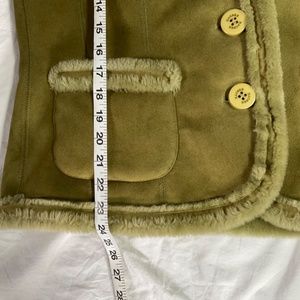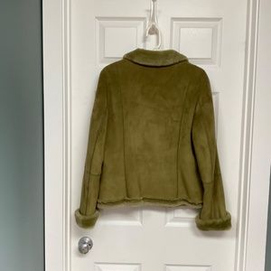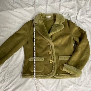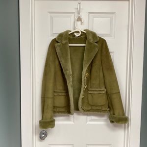 A maybe-worn-once short, sage green, faux shearling coat by Hauber (a German clothing company). The jacket is thick and soft, very cozy, and a seriously great sage green colour. This is an amazing jacket for fall. It’s a size 8, but it has a bit of a boxy fit, so I would say more of a size 10 really.