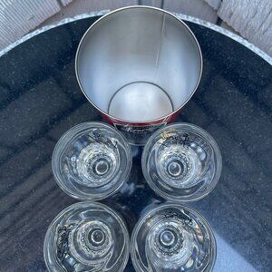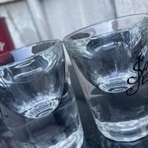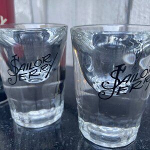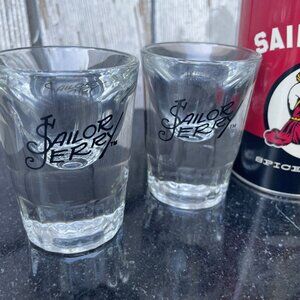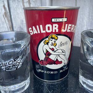 Sailor Jerry Shot Glass Lot 4 Heavy Thick Bottom & Spiced Rum Tin Cup. Two of the shot glass each have a small scratch, the others have light general wear, overall all 5 pieces are in great condition.