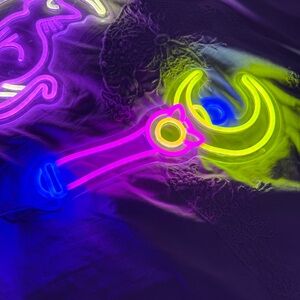 Brighten your space with this duo of anime inspired LED neon lights. This set contains a purple cat resting on a crescent moon plus the iconic Moon Stick wand. Both pieces glow with vibrant colors and use USB power with a simple on off switch. These look amazing in a bedroom office or gaming setup.