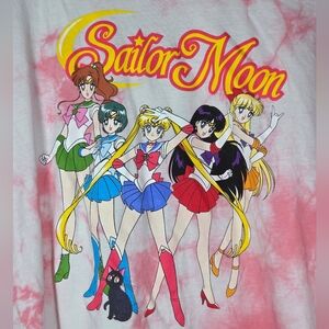 The shirt features a fun pink tie dye design & Sailor Moon and other Sailor Guardians in their signature outfits, posed in front of a crescent moon with the words "Sailor Moon" written in a stylized font.