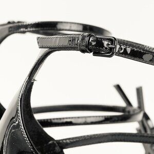 The Saint Laurent Cassandra Sandal in Black Patent Leather is a stylish and versatile choice for any occasion. Featuring a 4" stacked stiletto heel and an adjustable ankle strap with black-toned hardware, these multi-strap sandals are both comfortable and chic. The black-tone Casandre logo adds a touch of elegance to complete any outfit.