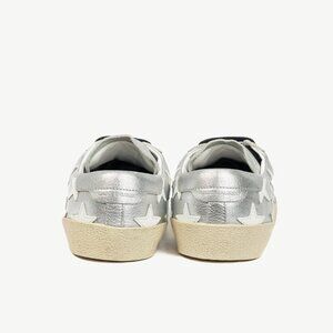 Made in Italy, these low-top sneakers from Saint Laurent are crafted in a metallic silver leather on the upper, and are appliqued in contrasting white leather stars. They feature closed rounded toes, front lace-up fastening, leather lining, and rubber outsoles.