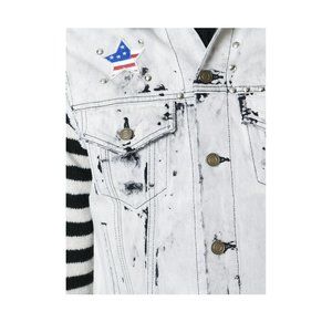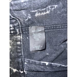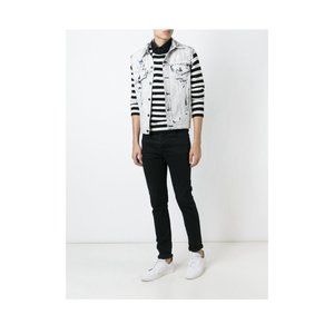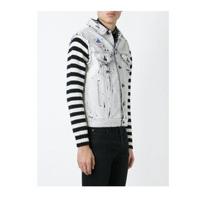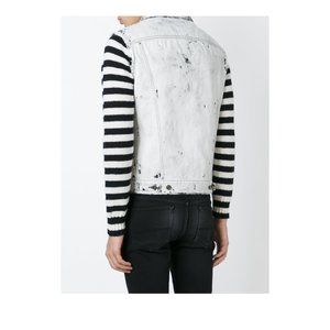 Grey cotton distressed denim gilet from Saint Laurent featuring a classic collar, two chest pockets, a front button fastening, side pockets, a sleeveless design, frayed edges, silver-tone stud detailing, a star patch and a straight hem.
