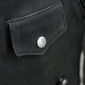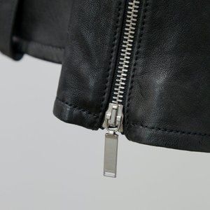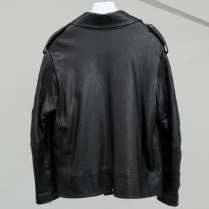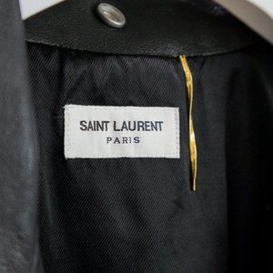 An oversized mens black leather jacket form Saint Laurent with classic motorcycle styling and “Saint Laurent” engraved silver-tone hardware.