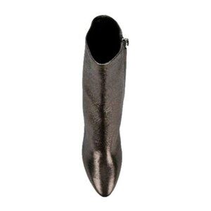 A covered block heel balances the pointed toe of a shimmering metallic bootie handcrafted in Italy.