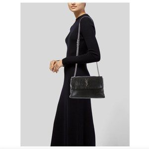 Black embossed leather Saint Laurent Medium West Hollywood Fold-Over bag with antiqued silver-tone hardware, single flat shoulder strap with chain-link accents, zip pocket at back, dual compartments, tonal woven lining, single interior zip compartment and snap closure at front flap.