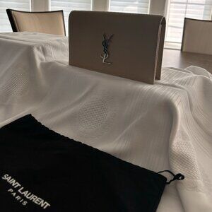 Saint Laurent 'Kate' clutch in beige pebbled leather with silver 'YSL' logo on the front. Features a magnetic closure and black grosgrain lining with one slip pocket.