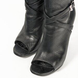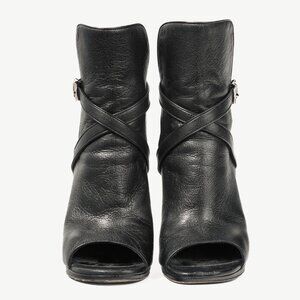 Made in Italy, these booties from Saint Laurent are crafted in a Nero black leather, and feature covered stiletto high heels, open rounded toes, wraparound buckled straps, and leather lining and soles.