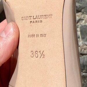 Saint Laurent Nude Patent Anja 100 Pumps. Nude patent leather exterior. Sleek minimalist design. Pointed toe. High stiletto heel. Deep vamp. Leather lining and insole. Leather outsoles. Made in Italy. Come with a Saint Laurent dustbag.