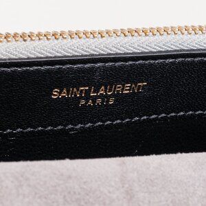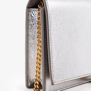 A show-stopping rendition of the classic ‘Kate’ silhouette from Saint Laurent crafted from textured silver leather and featuring a removable gold-tone chain strap with a leather shoulder pad, a front flap with a gold-tone YSL logo and a dangling tassel, and a snap-button closure that opens to a zipper-fastened pouch, 6 card pockets, and a slip pocket at the back.