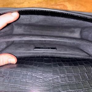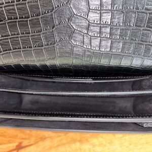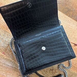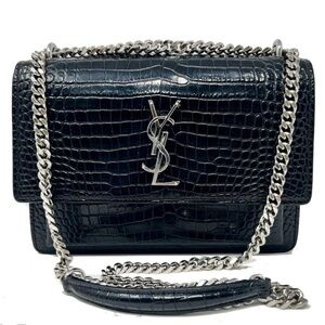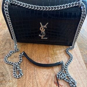 Authentic YSL crossbody purse. Great condition, one small scuff bottom left front corner. Black crocodile-embossed leather. Silvertone hardware. Chain and leather shoulder strap can be doubled, 11"-20.1" drop. Flap top with logo lettering; snap closure. Slip pocket under flap. Back slip pocket. Divided interior; suede lining.